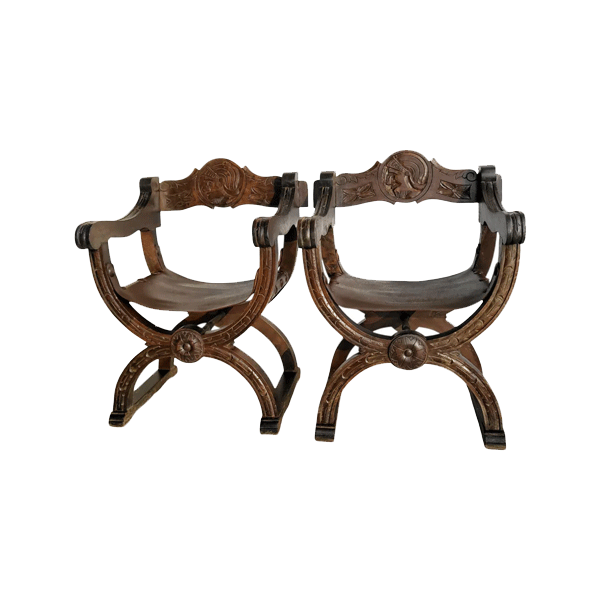 These Antique Italian Savonarola Chairs date back to the 19th century and are a beautiful example of Renaissance-inspired Italian furniture design. Named after the Savonarola folding chair style popularized during the Italian Renaissance, these chairs combine craftsmanship, portability, and decorative elegance.