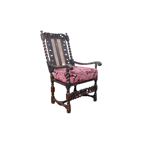 This Charles II Restoration oak armchair is a rare and exceptional example of 17th-century English furniture, dating from around 1670. Crafted during the Restoration period, it embodies the robust, elegant, and highly decorative style characteristic of post-Civil War England.